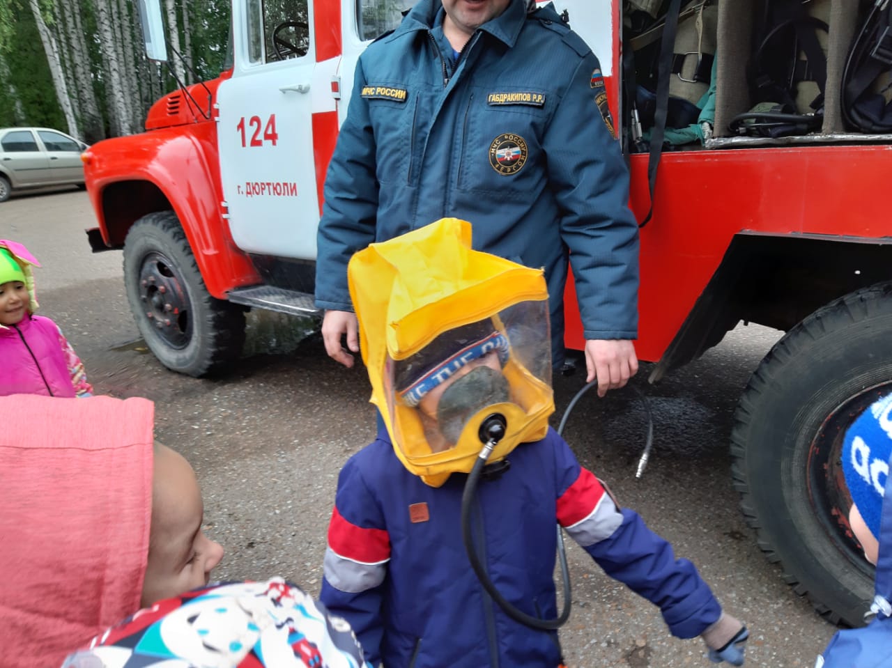Увидели, как правильно пользоваться противогазом при сильном задымлении. Ребятам разрешили примерить каски.