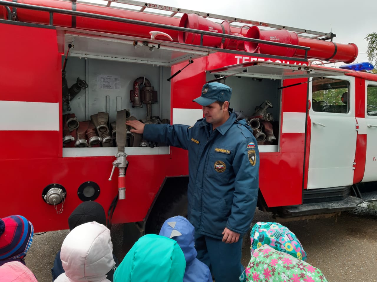 Эту экскурсию дети ждали с нетерпением, мы очень много говорили о том, что спички для детей не игрушки. Что при пожаре нужно звонить - 01. Дети с удовольствием рассматривали большие пожарные машины, которые тушат пожар. Оказывается в машине столько скрытых полезных секций.