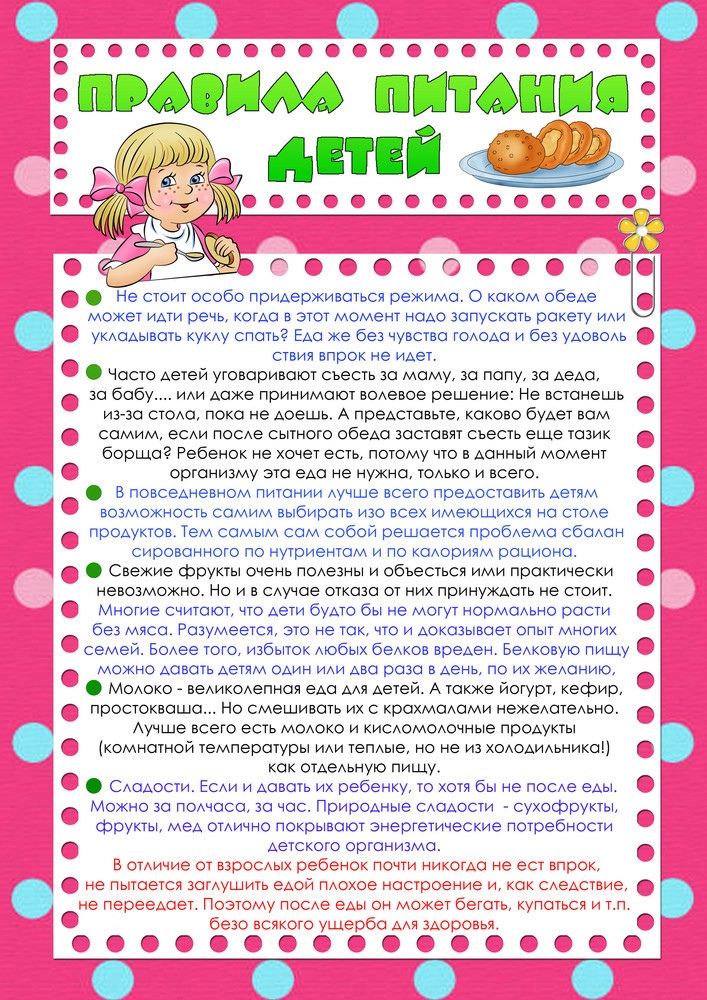- ешь не реже 4-х раз в день (на завтрак кашу, на обед салат, суп, второе и компот, на полдник булочку или фрукт, на ужин второе блюдо, перед сном кефир);