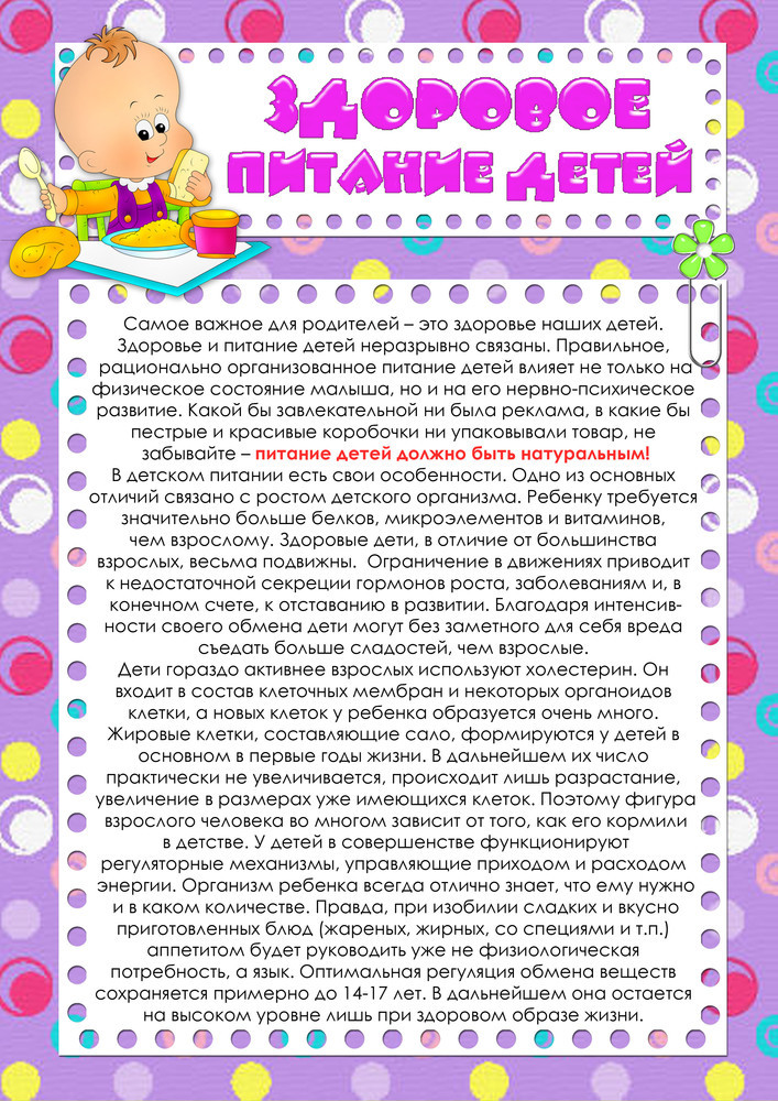 Программа предлагает адекватные возрасту детей формы обучения детей, предлагает родителям ознакомиться с рекомендуемыми нормами и принципами здорового питания, рациональным режимом организации питания ребенка, рекомендуемыми методами кулинарной обработки.